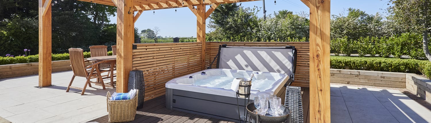 Heated hot tub Iron Kettle Kitchen Large patio and garden area Microwave |
